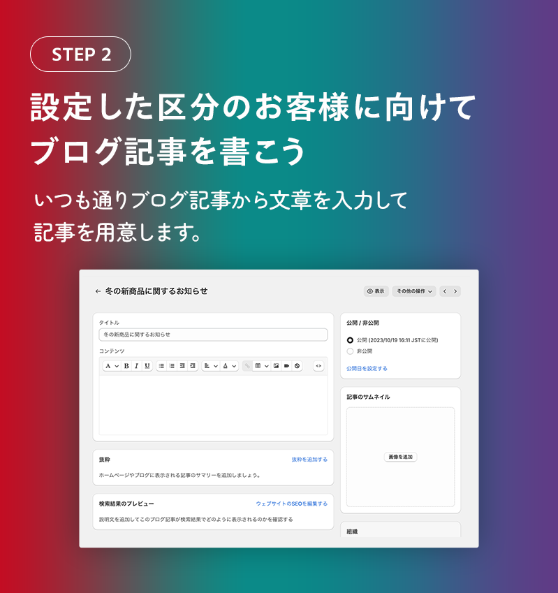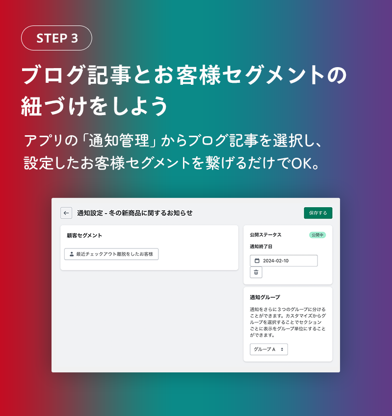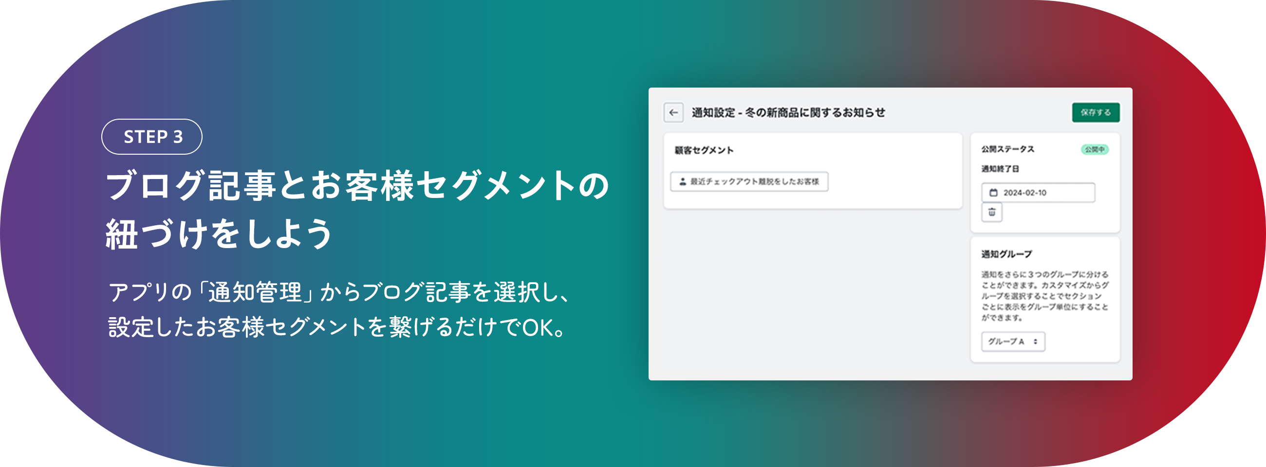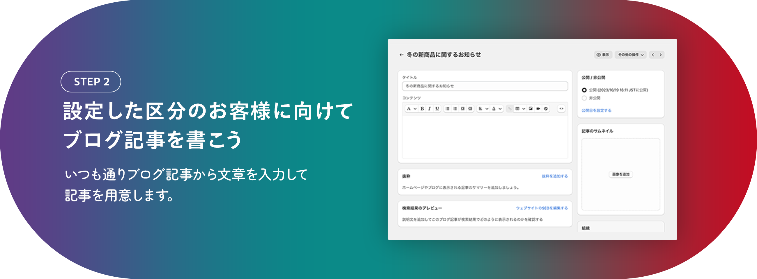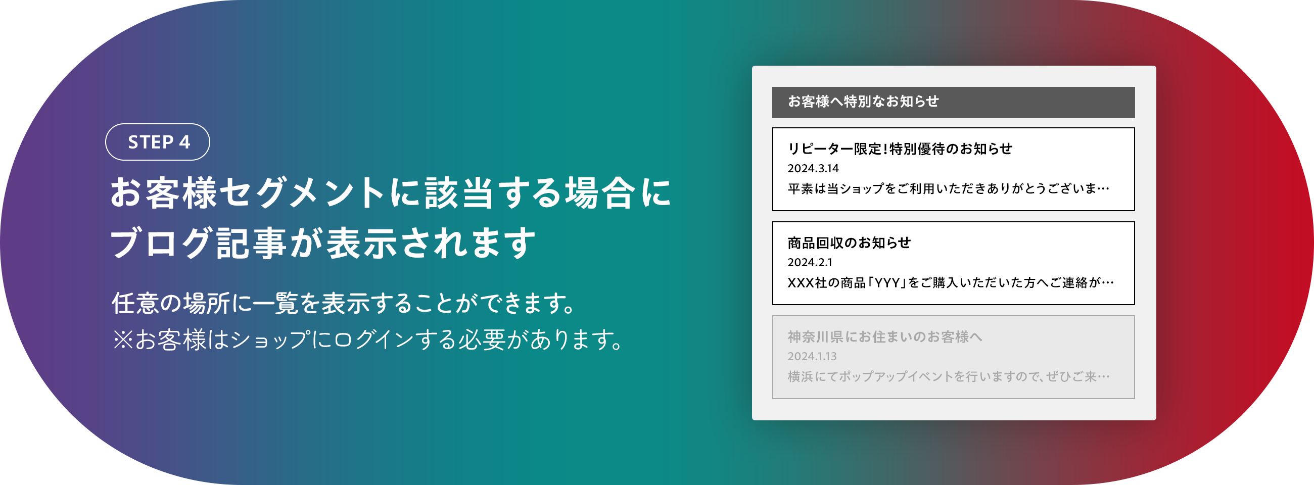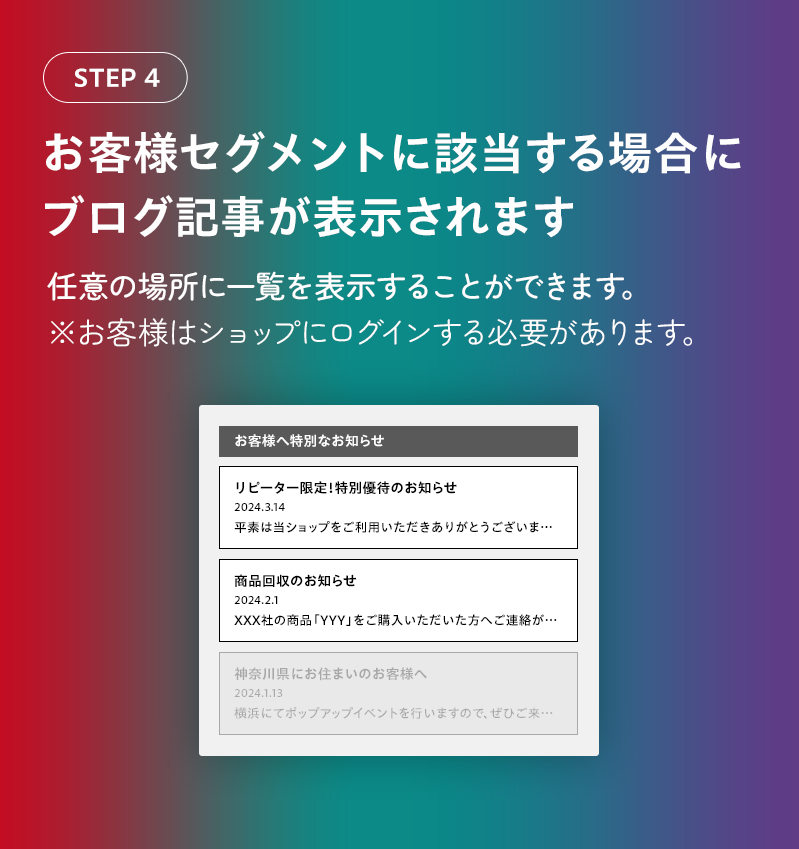 特定の区分のお客様に対して任意のブログ記事を表示することができます。
